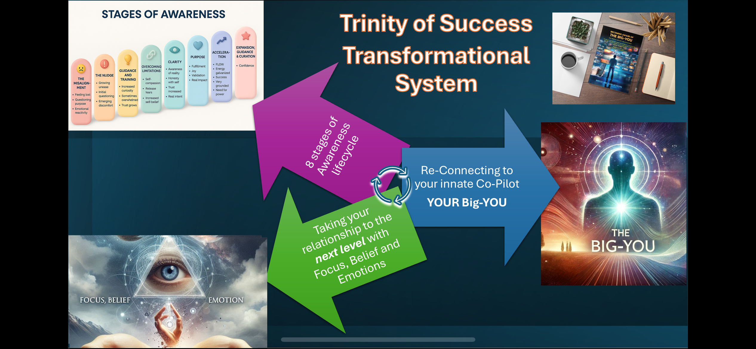 You’ll uncover the 8 stages of awareness lifecycle; how and why you need to connect to your Higher self, innate wisdom - the Big-YOU; and finally the 3 essential pillars that create lasting, aligned success when collaborating with YOUR Big-YOU:
